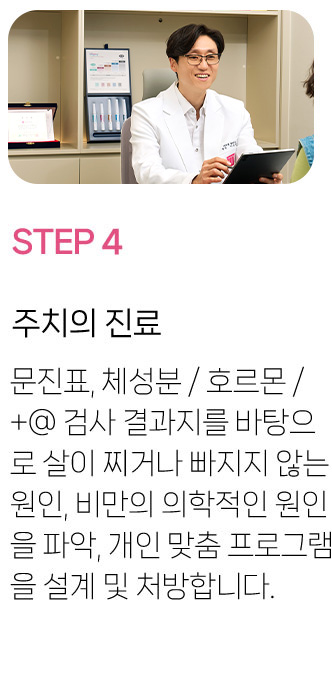 주치의+영양사+담당 실장이 한 팀이 되어 회원의 개인 체질과 라이프 스타일을 분석하고 성공적인 다이어트+요요방지 전략을 수립합니다.